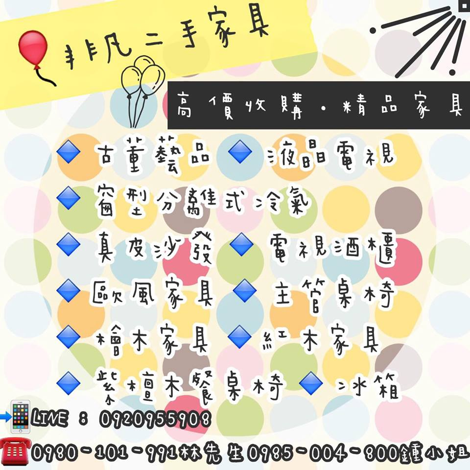 電器類:液晶電視 大小冰箱 變頻洗衣機 窗型/分離式冷氣 音響 小 家具類:紅木傢俱 古董家具 餐桌椅 沙發 電視櫃 衣櫥 床組 字畫 雕刻品 上下舖 高低櫃 餐櫃 流理台 衣櫃 書櫃 茶几 書桌 >>>>>>>>>>>>>>>>>>>>>>>>>>>>>>>>>>>>>>>>>>>>> 服務專線:0980-101-991 林先生or 0985-004-800 鍾小姐 (來信請附上欲估價之商品照片及連絡電話) 我們會盡快為您服務~ 或者+Line ID : 0920955908 上傳您的家具照片由 林先生為您線上估價 營 業 時 間 ☆ 星 期 一 ~ 星 期 六 ☆ 早 上 9:30 ~ 晚 上 20:00 周 日 固 定 公 休 室 內 客 服 電 話 : 04-25343325