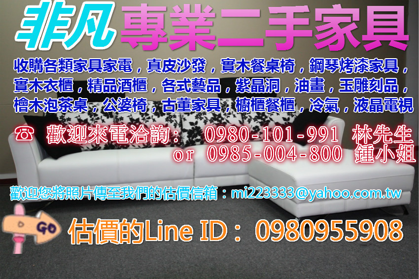 2. )、辦公家具:屏風 辦公桌椅 主管桌 洽談桌 會議桌 3. )、寢具:床箱/床架 上下舖 床頭櫃 衣櫃 化妝鏡台 4. )、電器類:液晶電視 電漿電視 窗型/分離式冷氣 各式冰箱 小冰箱 洗衣機 烘衣機 5. )、服飾店設備: 櫃台 吧台 吧台椅 鍛造展示架 展示櫃 6. )、美容器材:美容床 按摩指壓床 美容推車 美容椅 一通電話到府服務: 0980-101-991 林先生or 0985-004-800 鍾小姐 您也可以傳照片至我們的估價信箱: mi223333@yahoo.com.tw 專人線上幫您估價(請附上欲估商品照片、電話及姓名) 或者+Line ID : 0920955908 上傳您的家具照片由林先生為您線上估價 非凡二手傢具生活館,回收二手家具,一起愛地球!